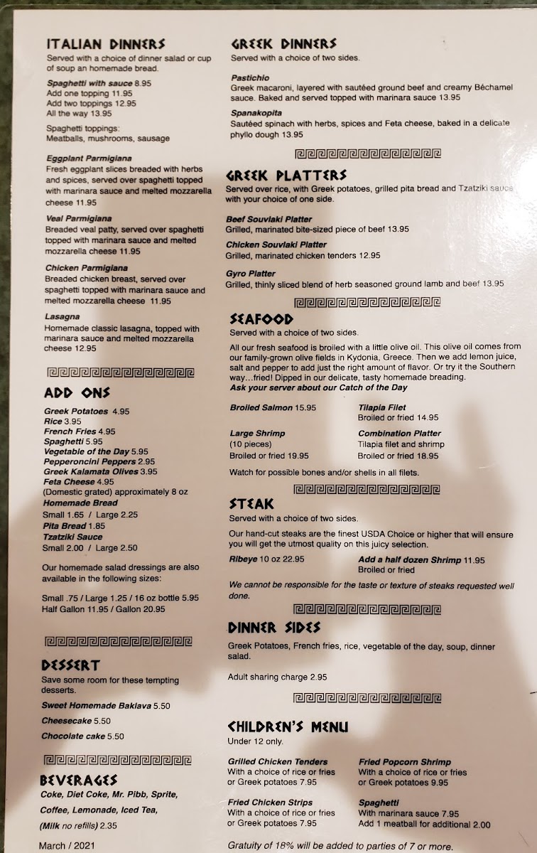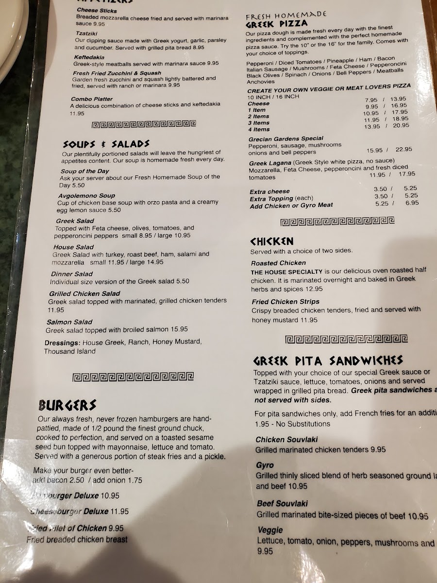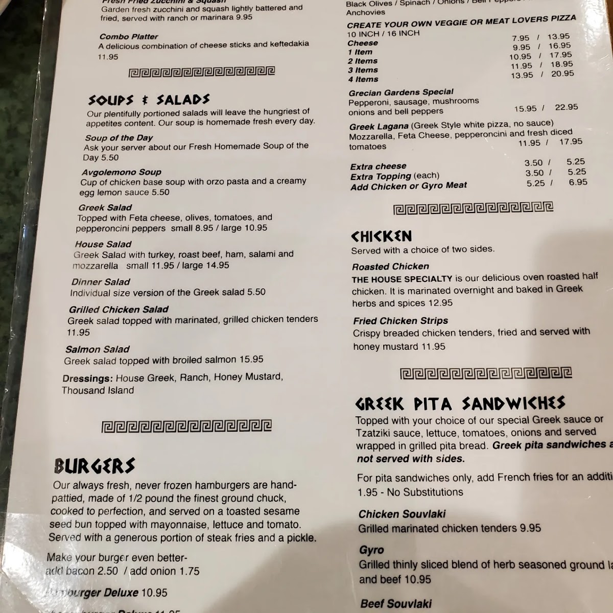For family meals, options like Marinated Beef Souvlaki serve four, providing a generous spread of Greek potatoes, salad, and bread. With rave reviews on both food quality and exceptional service, Grecian Gardens guarantees a memorable dining experience that will leave you longing for more. Come savor the flavors of Greece!